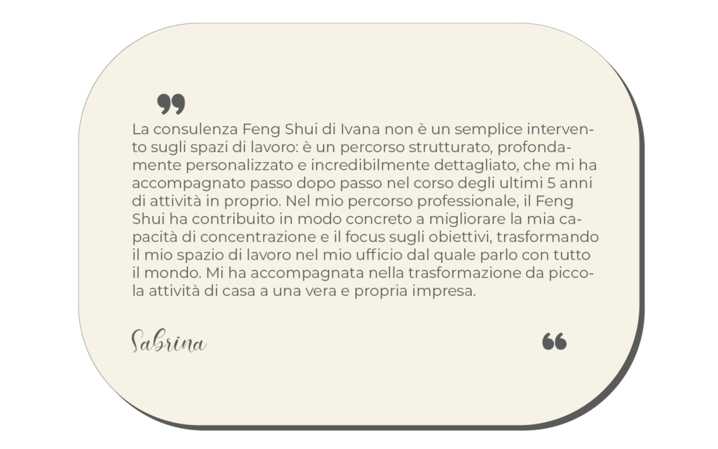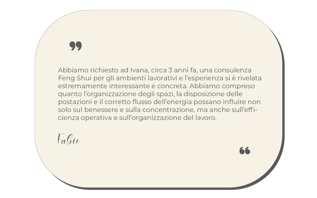 Con il Business Feng Shui verifico l’insieme del Brand Aziendale o personale e lo spazio che occupa l’attività seguendo schemi precisi di priorità da analizzare: ingresso e via d’accesso, reception, postazione lavoro, sala riunioni, ufficio dirigenza.