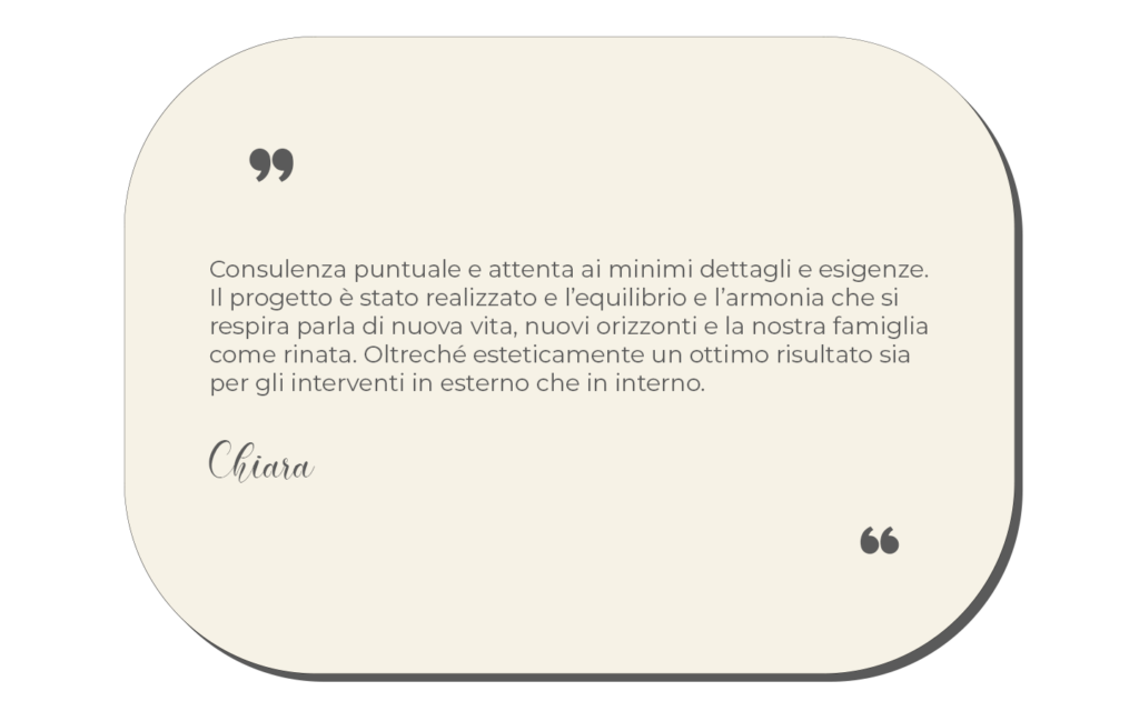 Offro consulenze in tutta Italia, con sopralluoghi e verifiche dirette, e seguo le diverse fasi dei lavori per garantire coerenza e qualità del risultato. Sono disponibile anche per consulenze online, mantenendo un approccio preciso e operativo.